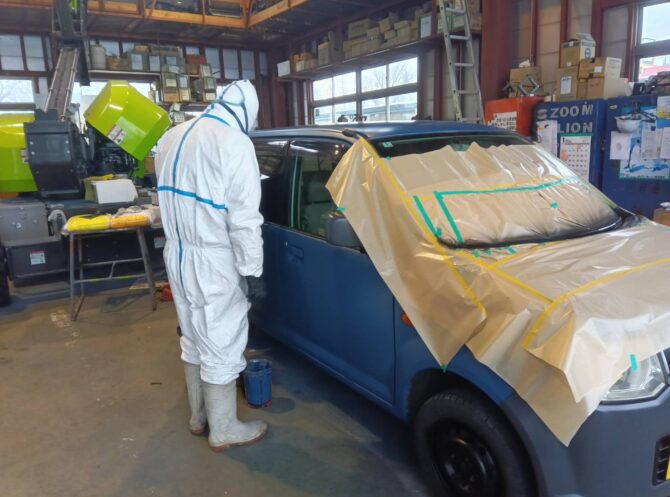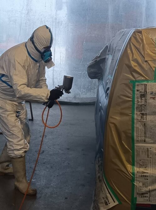 防護服を着て、特殊なマスクを装着して塗装をしています。