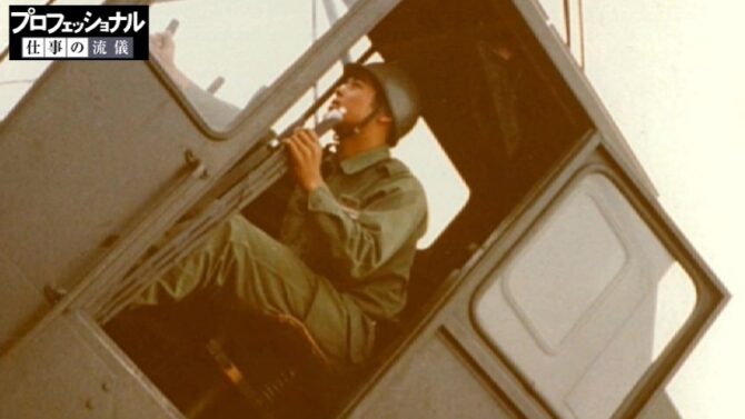 クレーンの免許は自衛隊時代に取得しました。当時20tクレーンに乗っているときの長谷川さん。