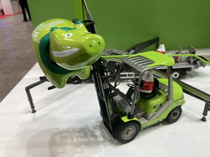 起き上がり小法師がフォークリフトで赤べこを持ち上げています!笑