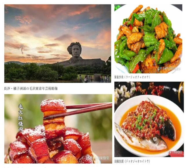斎藤:長沙市、湖南省の省都なんですね。とても魅力的なところです!省都というのは、日本でいう県庁所在地のようなものでしょうか。政治・経済・文化の中心であることが分かりました。個人的に橘子洲にある毛沢東の巨大な彫刻?を見てみたいですね!湘菜料理も気になったので調べてみました。湘菜料理は中国八大料理のひとつで唐辛子をたくさん使う四川料理と似ているものの、深みのある辛さと酸味を感じるのが特徴だそうです。サンラータンは湖南省の料理だったのですね、サンラータン好きですが、知らなかったです!夏は蒸し暑く冬は寒いという長沙市の気候風土に根差した食文化であるという印象です。