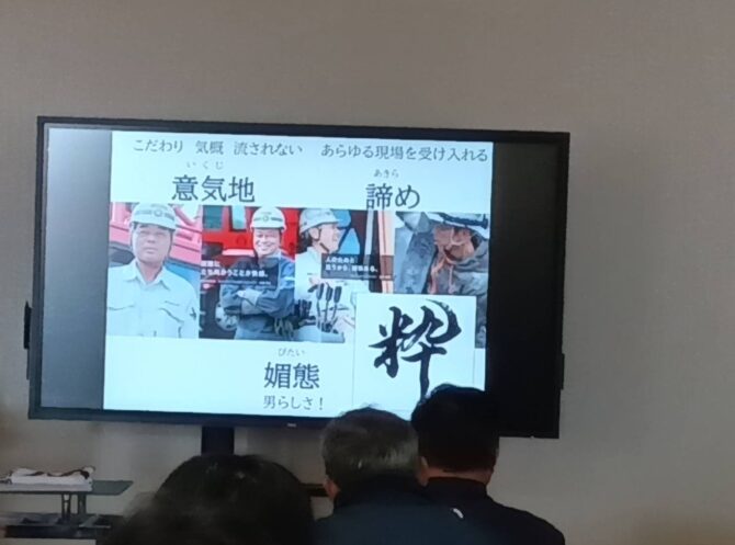 弊社の職人たちに粋の三要素をあてはめて…媚態=男らしさ、意気地=こだわり・気概・流されない、諦め=あらゆる現場を受け入れる…そんなあなたたちは粋です!!とまとめていて、なるほど~と思いました♪